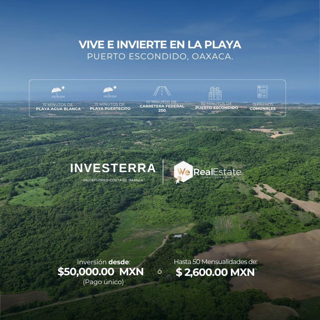 Investerra I es una opción accesible en una zona de crecimiento y alta proyección en la Costa de Oaxaca. Con más de 600 lotes distribuidos en terrazas naturales y vistas panorámicas al mar, este desarrollo ofrece una ubicación estratégica, a solo minutos de la Carretera Federal 200 y muy cerca de playas como Agua Blanca y Puertecito.
