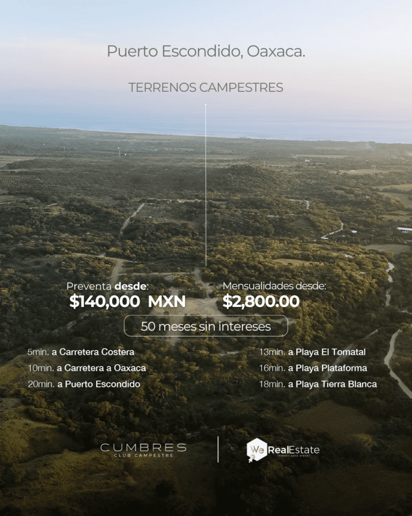 Cumbres Club Campestre es una opción accesible dentro de una zona campestre con proyección de crecimiento en la Costa Oaxaqueña. Con 167 lotes campestres distribuidos en un entorno natural amplio y ordenado, este desarrollo ofrece una ubicación estratégica, a pocos minutos de la Carretera Costera y con cercanía a playas como El Tomatal, Plataforma y Tierra Blanca.
